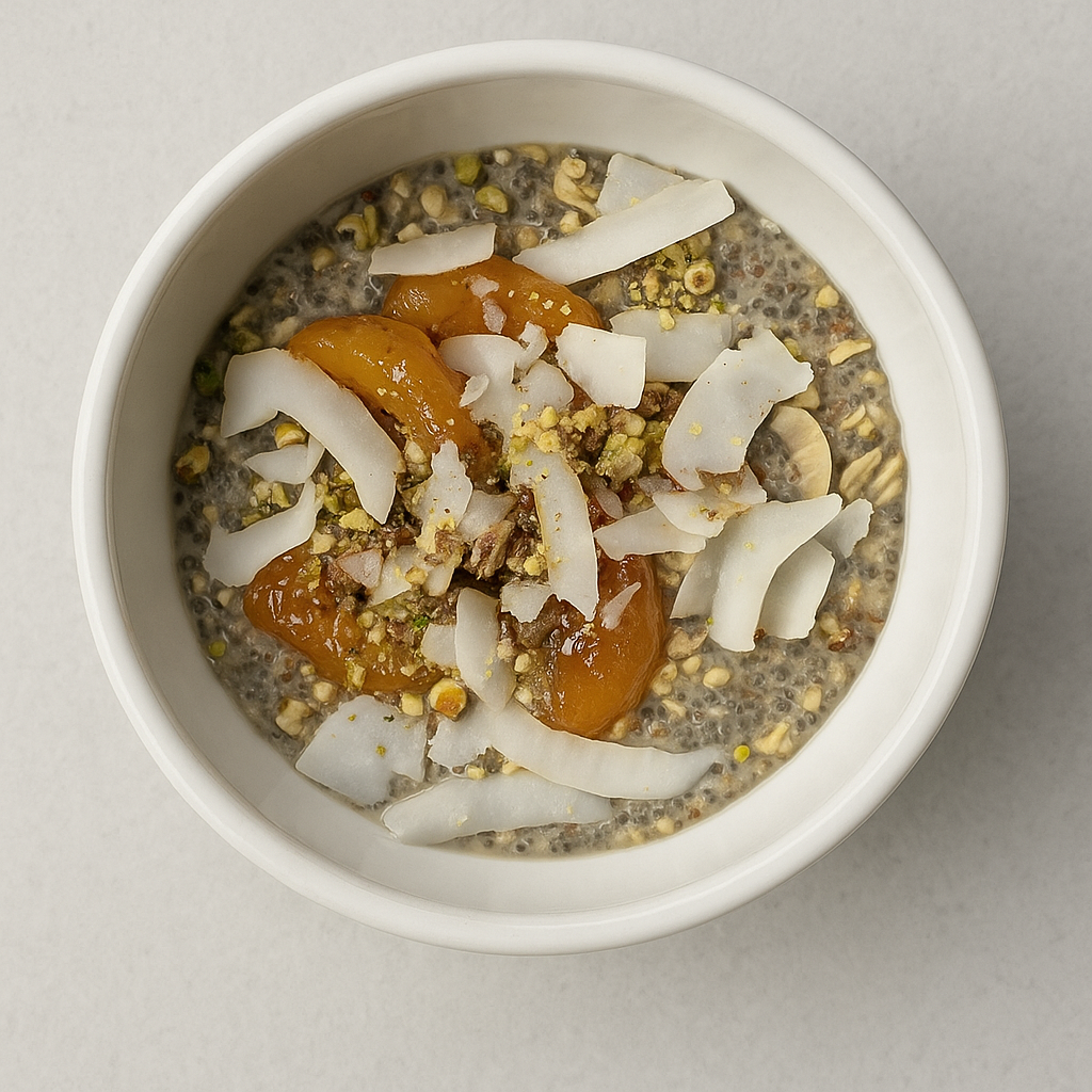 With caramelized nectarine , chia seeds , Aegina pistachios, and coconut flakes